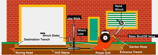 Widest variety of bits, accessoriesand our new ACCU-TRACK locating system.PROVEN to bore in Hard Rock Conditionswith our "GOLD" line of bits and reamers.We offer Sqd. 160 Extra HeavyDrill Stem.We use a 1" thread witha 7/16 hole for strength and max water flow.Our "JOY STICK" aimingdevise is the best idea for quick, accurate and SAFE bores.Our "SURFACE BORING GUIDE" aiming device works ABOVE ground, is heavier and sturdier, uses a real rifle scope to aim and securely holds the aiming tubes in place for a more accurate bore.We have the best Hand-Winch with our "Center Pull" design. Other winch designs are very hard to pull the cable out, our clever winch counter balance design makes it easy.